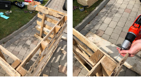 Step 2: Position the full crate on its side, slotting the half crates into each side to build the bar structure. Drill at least two screws into either side of the bar.